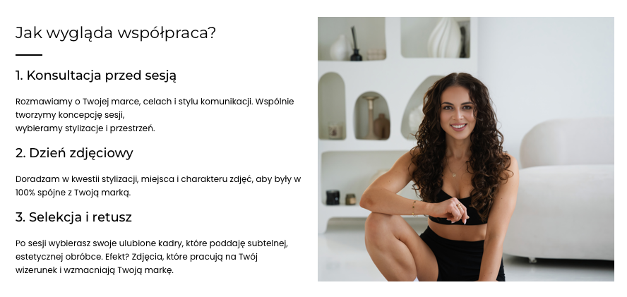 W moim portfolio znajdują się sesje, które budują wizerunek osobisty, wspierają rozwój biznesu oraz celebrują wyjątkowe chwile w życiu. Pracuję tak, aby każda klientka poczuła się komfortowo, pewnie i zobaczyła w sobie to, co najpiękniejsze
